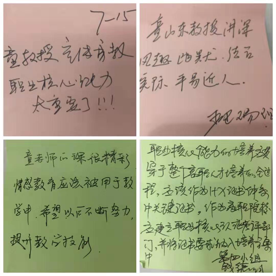 讲座课堂学员们互动热烈,学员们反映“童山东教授言传身教职业核心能力太重要了”,广东亚视演艺职院理阳阳副院长说,“童山东教授讲课风趣幽默,结合实际,平易近人”。揭阳职业技术学院信息技术专业带头人钱德明老师说,“职业核心能力的培养应该贯穿整个高职人才培养的全过程,应该作为1+X证书体系中关键证书,作为高职院校,应建立职业核心能力认证考评部门,并将证书要求纳入培养方案中”。